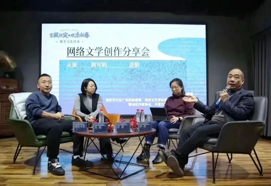 1月20日,河北保定市舉辦“網絡文學創作分享會”,邀請第五屆茅盾文學新人獎·網絡文學獎提名獎獲得者、河北省網絡作協副主席純銀耳墜做了《網絡文學:從讀到寫的進階》專題分享,并與河北大學藝術學院副教授、保定市文藝評論家協會副主席郎靜,青年文學評論家、保定市政府研究室副主任吳媛等嘉賓進行了對談交流。60多位本地作家和文學愛好者參加了活動。網絡文學評論家桫欏主持了分享會。