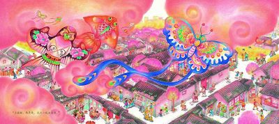 《大蝴蝶 小姐姐》講述的是女孩文文成為姐姐之后的一次夢幻式旅程:她和小狗坐在蝴蝶背上,在花田和胡同上空飛行,見到各種各樣的小動物家庭,從而對自己的新身份有了認同。不論是畫面還是文字敘述,文文的騎蝴蝶之旅無疑是整個故事最夢幻和絢麗的部分,作者用夸張的筆觸、飽和度很高的色彩以及跨頁大篇幅表達蝴蝶的美麗翅膀、小狗的驚訝表情,區別于日常生活畫面的細碎、復雜和工整,帶給讀者不一樣的視覺體驗。