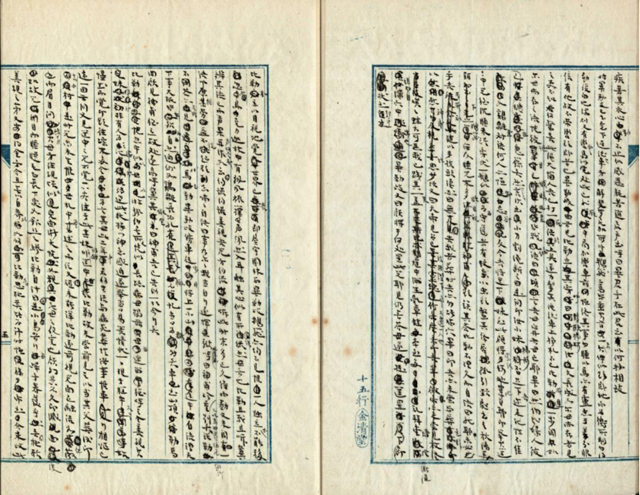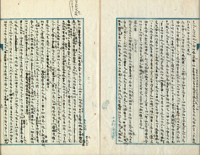 魯迅與周作人,這對中國文學現代史上的雙子星座,后來反目,但早年卻是“兄弟怡怡”,有很多共同從事文學活動的記錄,目前仍留存的相關見證物并不少,但是兄弟二人合作手稿并不多見。上海魯迅紀念館藏有一份周作人捐贈的翻譯手稿,卻是一件目前罕見存世的兩人早年深度合作的見證物。距今已經104年。這是經過簡單手工裝訂的一小冊,連封面共18頁。手稿用“金清堂”15行藍格直行的日本皮紙稿紙,毛筆豎寫,計約12000余字。封面上有周作人筆跡:“神蓋記 稿 一九一○年所譯 魯迅改本 原擬用于域外小說集第三冊者”。內頁是由周作人起草,魯迅修改的文本。字跡是蠅頭小楷,繕寫得密密麻麻,魯迅的修改字跡更為細小。有幾頁已經改得面目全非了:有劃掉的,有打圈表示刪除的,有旁添的,也有眉添的,有的整句刪改,甚至整段旁添。還有前后句調換等等情況。由于稿紙行距本來比較窄,改添的內容比較多,因此字體更加細小,有的還因字體潦草,字跡模糊,讀來十分吃力。還有以濃墨涂抹的,要想辨識被涂去的內容就更加費勁了。