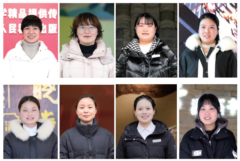 第一排(從左至右):劉勝男(作家出版社書屋)、李群芳(兒童文學書屋)、郭蓉(王躍文書屋)、李葉青(劉慈欣書屋);第二排(從左至右):鄧佩玲(梁曉聲書屋)、姚小玲(莫言書屋)、徐英(賈平凹書屋)、繆青湘(劉震云書屋)