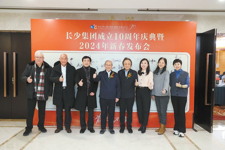 在長江少年兒童出版社(集團)有限公司成立10周年慶典暨2024年新春發布會上的合影。從左至右依次為高洪波、海飛、曹文軒、束沛德、王泉根、葛競、陳暉、崔昕平。