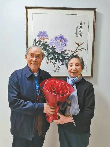 2024年新年,束沛德與夫人手捧文友贈送的鮮花,合影留念。