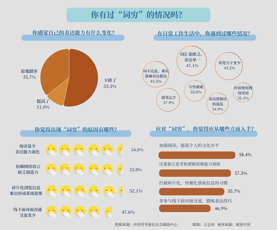 近日,《中國青年報》公布的一份社會調查問卷結果顯示,在1333名受訪青年中,53.3%的受訪者感覺近幾年自己的語言文字表達能力下降,47.1%的受訪者感覺自己詞匯量匱乏、表達單一。年輕人“詞窮”的問題不容小覷,“詞窮”顯示的是年輕人表達能力的弱化,這不僅會影響人際交往,也不利于以后的職業發展。為此,本報特采訪多位年輕人,就此問題進行深入觀察。
