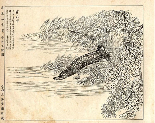 《山海經》記載的說鯥其狀如牛,所以《山海經》的插圖都把鯥畫成牛的樣子,到明清時期直到晚清時期的一些畫里面,又把穿山甲畫得像揚子鱷。為什么穿山甲后來又變成鱷魚了呢?這依然跟書的記載有關系,因為到了宋代以后的古書上都說穿山甲長得像鱷魚一樣。宋代羅愿的《爾雅翼》說,“鯪鯉,四足,似鼉而膽小”,鼉就是揚子鱷,南方人叫它豬婆龍,李時珍《本草綱目》也說,“鯪鯉,狀如鼉而小”,都把穿山甲比作揚子鱷,所以后來的人畫穿山甲就畫成了鱷魚。大家看這兩幅畫,左邊這幅就是見于一本古書,一本明代古書,叫《三才圖會》,它里面就畫有穿山甲,你看它上面寫著“鯪鯉”,這是穿山甲,你看他畫的就一個爬行動物嘛,與其說是穿山甲,不如說更像鱷魚。