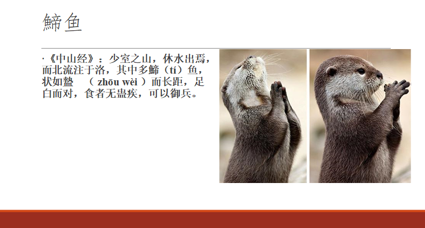 再看一種,《中山經》:“少室之山,休水出焉,而北流注于洛,其中多?(tí)魚,狀如蜼( zhōu wèi )而長距,足白而對,食者無蠱疾,可以御兵?!甭逅杏幸环N魚叫?魚,長得像猴子(蜼)一樣,長著長長的腳指頭(長距),腳心是白色的,喜歡把手對一塊拍巴掌(足白而對),這就是水獺。水獺不是魚類,但水獺它生活在水里面,所以古人把它稱為魚。水獺長得確實跟猴子體型、顏色都很像,它的指頭非常長,因為它生腳蹼,并起來顯得它的指頭很長,它的巴掌是白色的,經常雙手合十,像是拍巴掌的樣子。由此可見,古人的觀察是多么細致而準確。我們知道水獺喜歡吃魚,它捉了魚吃不了會擺在河岸上,又因為它喜歡雙手合十拍巴掌,古人看它經常對著捕獲的魚雙手合十,就誤認為它在向魚做禮拜,所以古書中有“獺祭魚”的說法。小朋友都知道日本非常有名的一個怪物叫河童,河童的腦袋中心不長毛,它喜歡把水邊的人或者動物拖到水中去,河童其實就是從水獺演變過來的,最早就記錄在《山海經》里面。