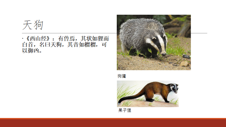 《山海經》那些所謂怪物指的是什么動物,證明這本書并非怪物志,而是一個博物志。下面我就不用賣關子了,我把左邊放文字,右邊放圖畫,大家一看就明白。