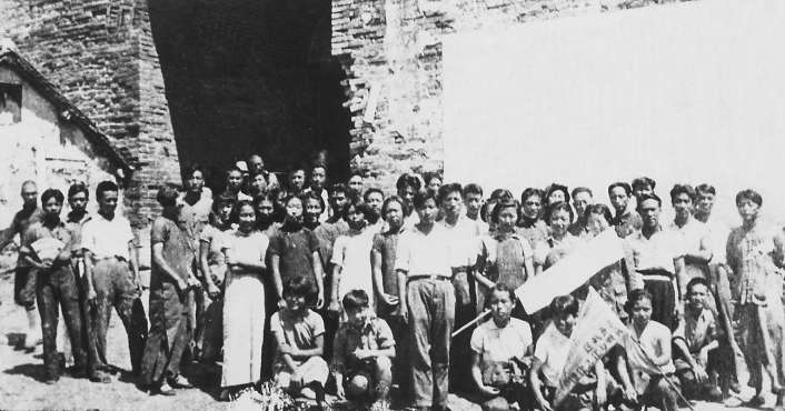 1938年,臧克家率領的第五戰區戰時文化工作團與河南“戰教團”聯合演出后合影。站立者右六為臧克家。