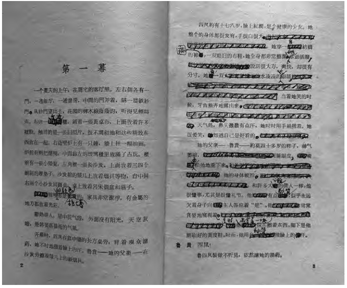 曹禺一向不注意留藏自己的手稿和著作,不過他在書信中對修訂進展的描述,可以為重構曹禺修訂方法提供一些基本思路。從曹禺致李致的書信中,可以看到,在為“川版曹禺戲劇集”做修訂時,《雷雨》《日出》《原野》《蛻變》《北京人》五部劇作選了“文化生活出版社”的舊本子作為底本來修訂,而他在校對時,還會拿其他版本進行比照,比如選了1957年中國戲劇出版社的單行本來校對《雷雨》,選了文化生活出版社的單行本來校對《原野》2。遺憾的是,上述修訂的原始稿件已不可見。值得慶幸的是,1961年人民文學出版社《曹禺選集》的編輯王仰晨非常細心地留存了當年《雷雨》和《日出》兩劇的付印本(包括修訂手稿),從這兩個付印本可以清晰地看出曹禺當時的修訂方法和策略。而這一《雷雨》付印本,可以視為《雷雨》各修訂版中唯一可見的完整手稿。