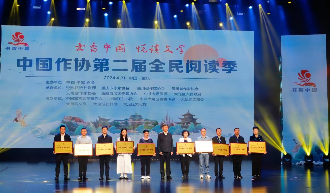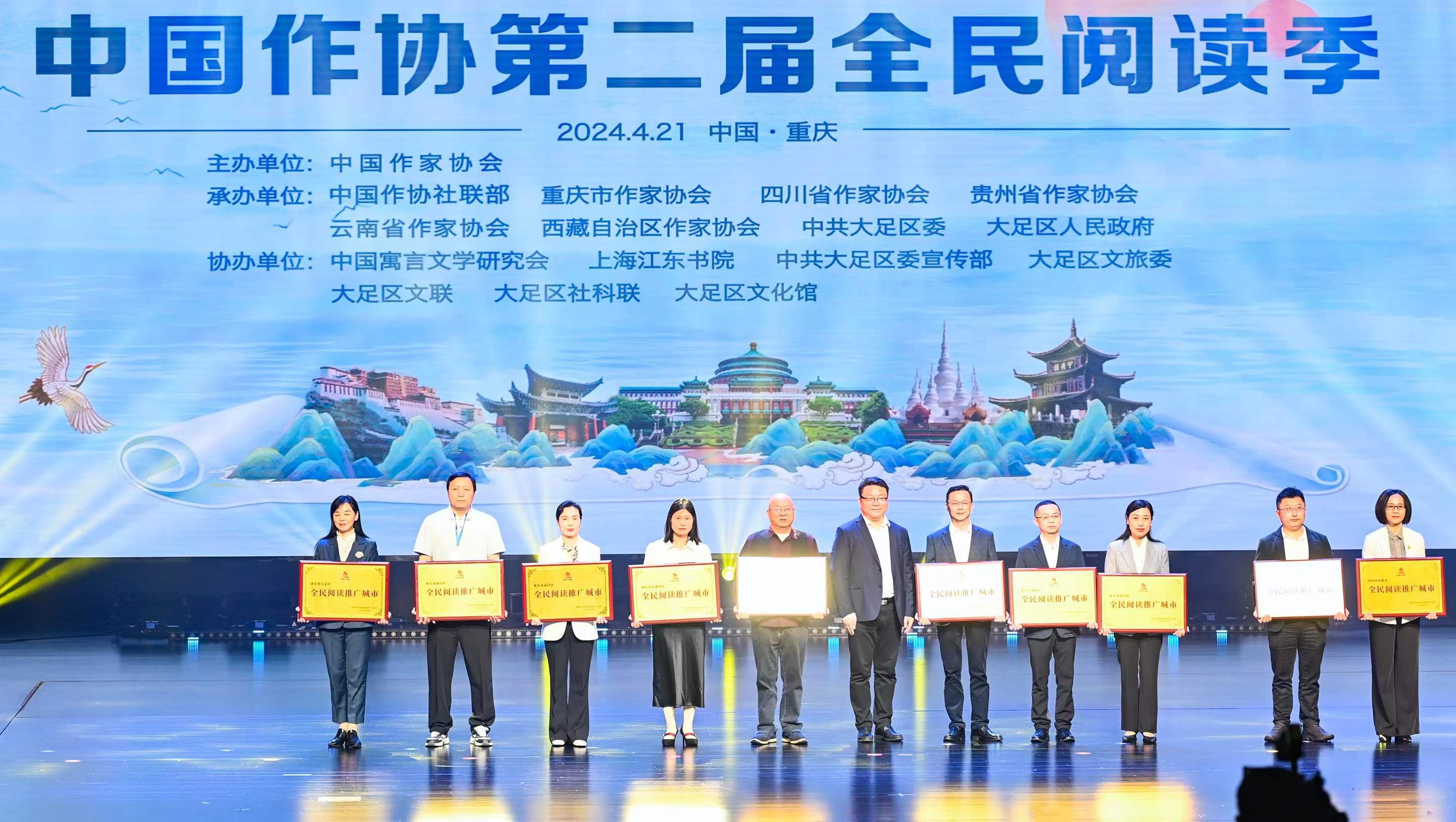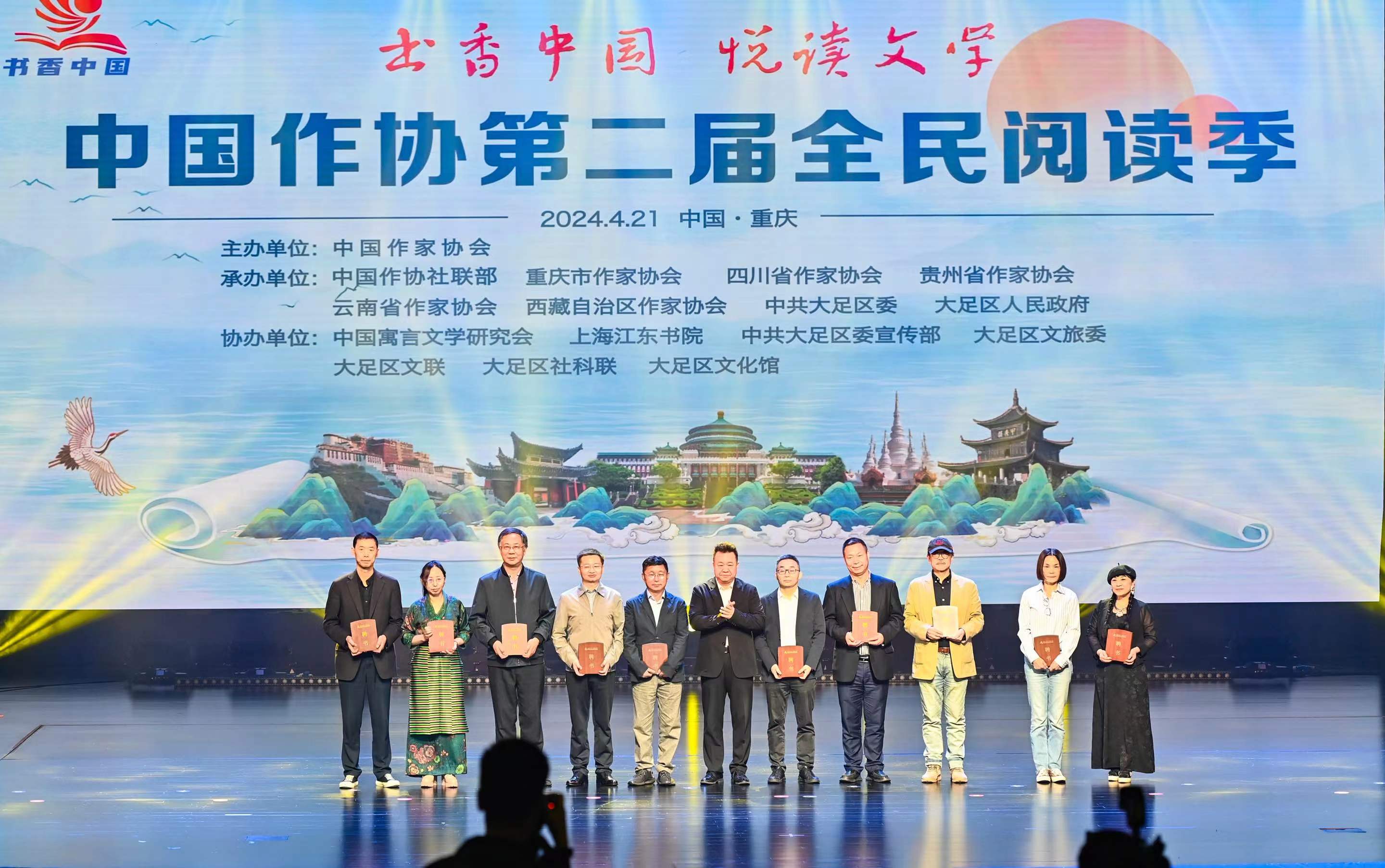 為深入學習貫徹習近平文化思想及習近平總書記致首屆全民閱讀大會舉辦的賀信精神,4月21日上午,“書香中國 悅讀文學”中國作協第二屆全民閱讀季啟動儀式在重慶舉行。中國作協黨組成員、副主席、書記處書記邱華棟,重慶市人大常委會副主任、黨組成員、市總工會主席陳元春,中國作協副主席、四川省作協主席阿來,重慶市委宣傳部副部長、市新聞出版局局長馬然希,中共重慶市大足區委書記陳一清出席啟動儀式。重慶、四川、貴州、云南、西藏作協相關負責人,王躍文、東西、歐陽黔森、范穩、李駿虎、冉冉等作家,中國作協團體會員單位、主管文學社團代表,以及重慶市民代表參加活動。