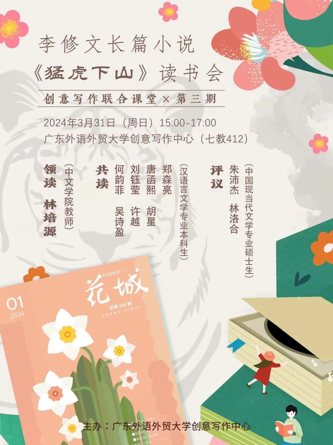 3月31日,廣東外語外貿大學中文學院本科生、碩士生,圍繞作家李修文的長篇小說《猛虎下山》,以“共讀”方式探討文學如何表現時代、書寫個人心靈、創造性轉化傳統敘事資源等話題?;顒佑芍形膶W院青年教師林培源主持,中國現當代文學專業碩士生朱沛杰、林洛合擔任評議人。