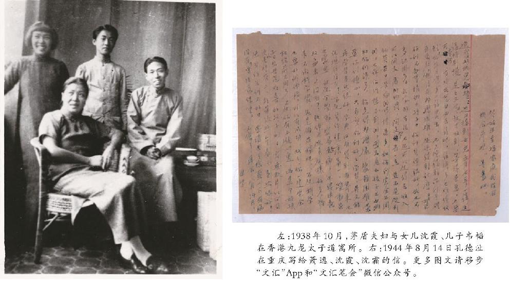 左:1938年10月,茅盾夫婦與女兒沈霞、兒子韋韜在香港九龍太子道寓所。右:1944年8月14日孔德沚在重慶寫給蕭逸、沈霞、沈霜的信。