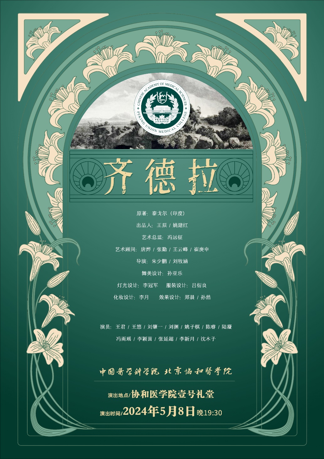 5月8日,由北京協和醫學院、北京人民藝術劇院共同創排的泰戈爾抒情詩劇《齊德拉》在北京協和醫學院壹號禮堂上演?!洱R德拉》是泰戈爾于1891年借用史詩《摩訶婆羅多》素材改編的詩劇,講述了曼尼普爾國公主齊德拉在春神與愛神的賜佑下獲得為期一年的絕世美貌,贏得了英雄阿順那的愛。此后她卻陷入虛假身份與真實自我的矛盾抉擇,靈魂備受拷問。劇終,她揭開面紗,向愛人顯露本貌并坦陳真相,阿順那深情接受了真實的她。1924年,泰戈爾訪華期間,為慶祝其64歲生日,由徐志摩、林徽因等新月社成員在協和禮堂主演了此劇,這也是《齊德拉》英文版首次在中國演出。100年后的今天,由北京人民藝術劇院院長馮遠征擔任藝術總監,朱少鵬、劉牧涵導演,北京協和醫學院學生再次演出這部經典劇目,具有重要意義。