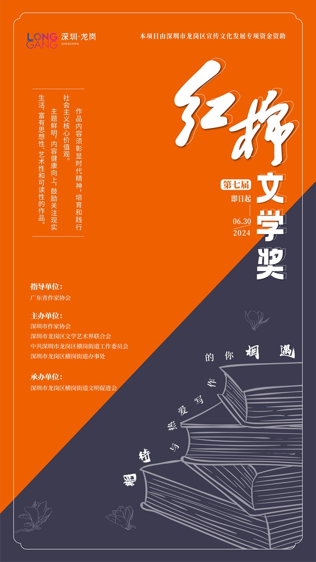 為深入學習貫徹習近平新時代中國特色社會主義思想和黨的二十大精神,助推新時代文學高質量發展,講好中國故事、傳播好中國聲音,展現可信、可愛、可敬的中國形象。彰顯深圳先行示范作用,弘揚社會主義核心價值觀,發現推介當代原創文學精品力作,展現文學的蓬勃生命力,第七屆 “紅棉文學獎”征文活動即日啟動。