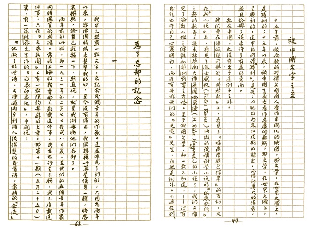 魯迅雜文《為了忘卻的紀念》《祝中俄文字之交》手稿,收錄于《南腔北調集》