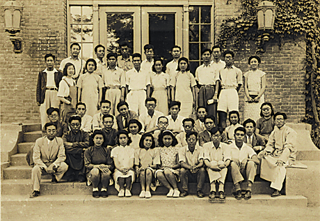 王瑤和學生們的合影:前排左起依次為錢理群、王瑤、吳福輝,后排左起依次為陳平原、張玫珊、溫儒敏