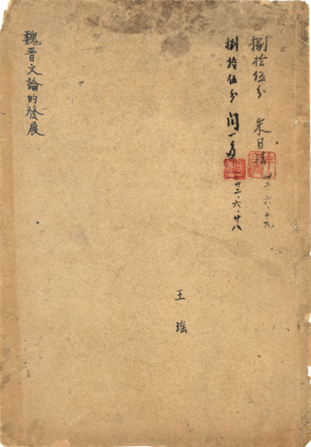 王瑤學位論文《魏晉文論的發展》封面,有朱自清、聞一多的打分