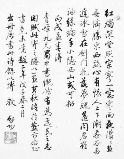 啟功先生在《啟功口述歷史》中,曾深情回憶到祖父教他念詩時候的場景,而且少年時便開始學寫詩,曾有《社課詠春柳四首擬漁洋秋柳之作》等少作,且轉益多師,終生不廢吟誦。其生平舊體詩作,結集有《啟功韻語》《啟功絮語》《啟功叢稿·詩詞卷》等。并有《詩文聲律論稿》這樣的精深專著。啟先生1946年贈給柴先生的這首詩作,不論是遣詞造句,以及用典等,無不顯示出其深厚的舊體詩功底,而且寄托了對友人深摯的思念。作為啟先生老友的柴德賡先生,亦雅好舊體詩,其詩稿至今尚存,并將收入商務印書館即將刊行的《柴德賡全集》中。柴、啟兩先生,除了平日砥礪學術,還互相詩酒唱和,這從啟先生《次韻青峰吳門見懷之作》、柴先生《寄懷元白兄》等作即可看出。而他們之間的深厚友誼,則貫穿了整整一生。