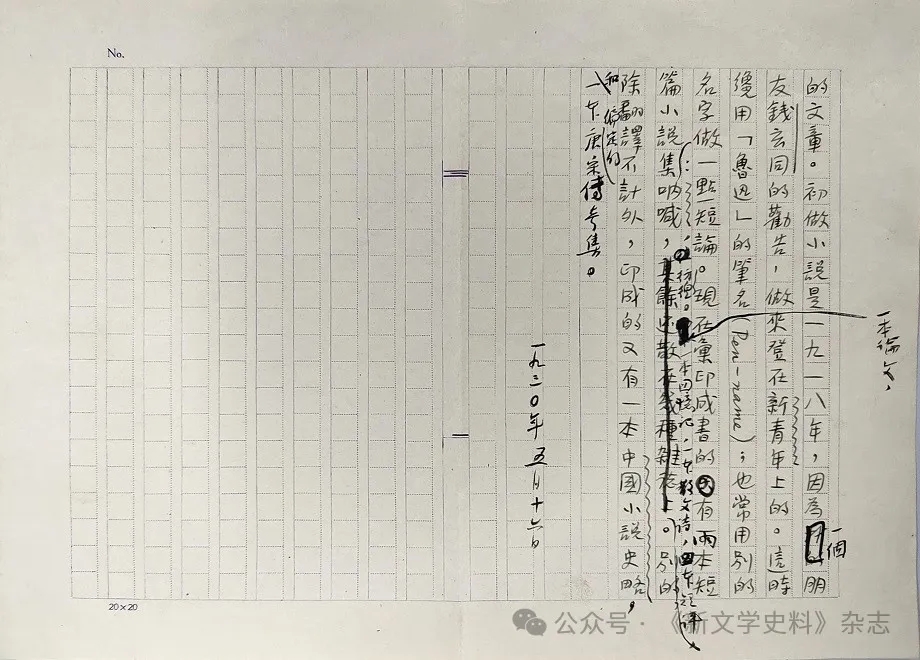 不同于用于再編的、經過修改謄寫的《南腔北調集·〈自選集〉自序》手稿,“魯迅手稿補遺一頁”是用于初次刊印的,寫作時間應即《南腔北調集·〈自選集〉自序》文末所記“一九三二年十二月十四日”。筆者翻查了此日前、后數年的魯迅文稿,檢出由柔石錄寫、魯迅題名并作改的《魯迅自傳》手稿⑥,所用稿紙和“魯迅手稿補遺一頁”相似度較高,頁面布局、紋路細節基本一致。此種《魯迅自傳》稿共三頁,一列二十格,共二十列,格線淡紫色;稿紙高19.4cm,寬27cm,頁眉左端印“NO.”,頁腳左端印“20×20”。此稿第三頁只占用了右半頁,左半為空白稿紙,為便于比較觀覽,錄末頁圖版于此,見上圖。