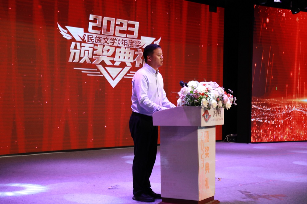 吳學榕代表中共麗江市委對頒獎典禮的舉辦表示祝賀,對參加典禮的各位嘉賓、作家表示歡迎。他表示,民族文化孕育出民族文學,民族文學又集中展現著民族文化,如同一面鏡子,清晰地映照出一個民族的靈魂深處。多民族和諧共融、生生不息造就出的獨特民族文化是麗江的“靈魂”,一批又一批的麗江民族文學工作者,始終堅持為人民書寫、為時代放歌,創作了許多精品佳作,擦亮了“文化麗江”品牌?!睹褡逦膶W》年度獎頒獎典禮在麗江的持續舉辦,必將有力促進麗江民族文學人才培養和優秀作品創作,為麗江文化發展注入持久的原動力。