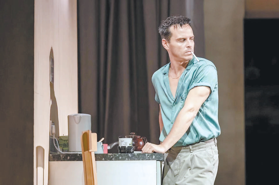 如同安德魯·斯科特在采訪中曾提到的,將自己投射到所有角色的過程,使他逐漸意識到這些角色之間的相似之處。契訶夫《萬尼亞舅舅》中的所有人物,內心都充滿苦悶,但生活循環往復,痛苦無從解答,勞累和重荷不曾止息,疲乏和困頓是日常的底色。由一人飾演全部角色的《萬尼亞》,恰恰強化了這種悲劇的普遍性。安德魯·斯科特對道具的使用和對肢體的掌控非常精準,開關門、推拉酒杯、手的撫摸等都由兩人間的呼應,轉變為一個人的自我拉扯和掙扎不休。靈巧自如的轉換間,展露的情緒也有了多重含義。索尼婭的苦澀也流淌在伊萬醉酒后的眼淚中,海倫娜和醫生的對手戲里,男女兩人的情愫與壓抑都盛滿在安德魯·斯科特那自帶憂郁、破碎氣質的一雙眼眸之中。