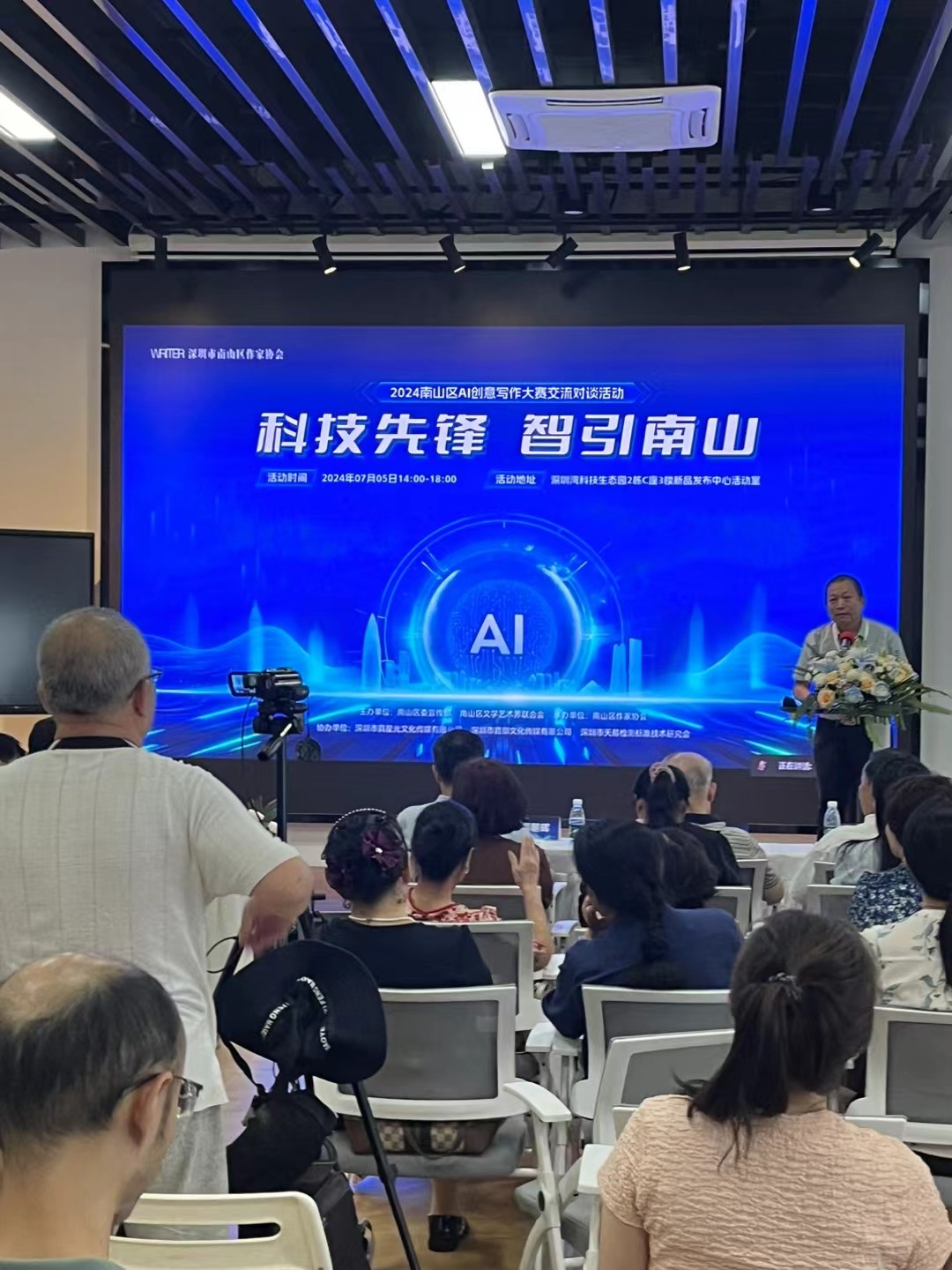 7月5日,由中共深圳市南山區委宣傳部、南山區文學藝術界聯合會主辦,南山區作家協會承辦的“科技先鋒 智引南山——2024南山區AI創意寫作大賽”對談交流活動在南山區科技生態園舉辦。80多名來自南山區和深圳其他區的作家參與會議。會議同步線上直播,南山區作協對口“文學援疆”的南疆喀什的作家、老師及深圳作家等100多人線上聆聽。南山區作協主席吳笛主持會議。