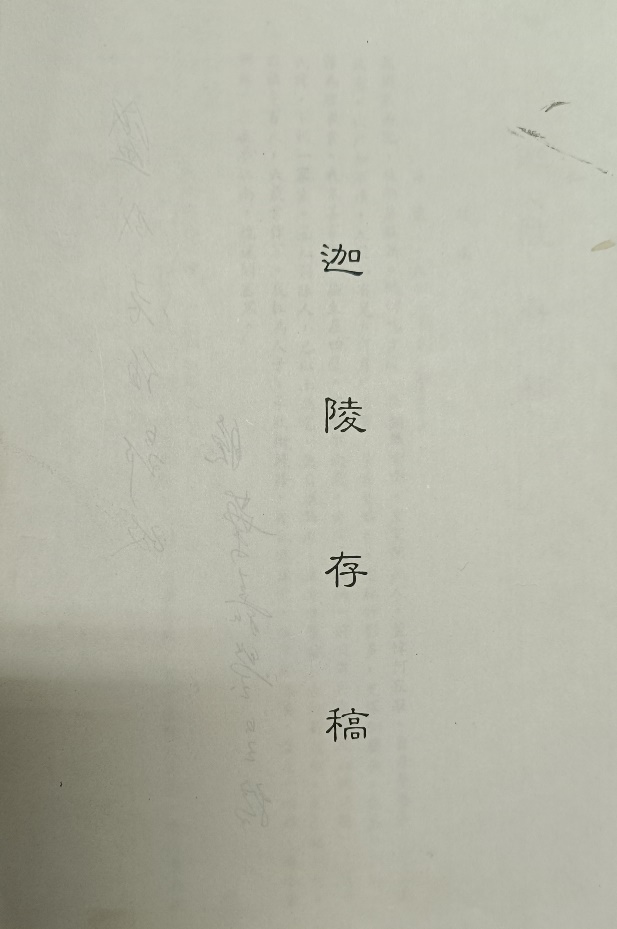 先生的大名我是早已聽說,但可惜沒有見過面。至今想起,仍為憾事。我趕忙打開檔案,翻閱這份存有先生手跡的珍貴資料。這是一份打印稿,第一頁豎排印著書稿名稱“迦陵存稿”。其背面寫有兩行字“盛成老伯郢政 晚葉嘉瑩呈稿”?!佰眱勺治液苌僖姷?,大致能猜到它的意思。為準確把握這個詞,我特意查詢了一下,有關它的介紹大致如下:郢政意為郢正,斧正。明朝黃中在其 《重刻朱子年譜記》一文中,有這樣的表述:"且身處孤陋,書籍不全,暫作裨諶之補,祈請諸君更為郢政。" 清朝魏際瑞在《與子弟論文》中是這樣的:"人以文字就質于人,稱曰'正之'。忽念政者,正也。改稱曰'政'。又念正者必須刪削,乃曰'削政'。又念斧斤所以削也,轉曰'斧政'。又念善斧斤者莫如郢人,易曰'郢政'。"也許是這個詞有些偏僻,后來人使用的不是很多。這份打印稿豎排打印,右側裝訂,共27頁。書稿收錄了43篇詩詞,創作時間跨度長達42年,創作時間最早的是1941年先生17歲時寫的五言詩《詠懷》,“高樹戰西風,秋雨檐前滴。蟋蟀明空庭,夜闌猶唧唧?!挂箟艚?,魂迷關塞黑?!眲撟髯钔淼氖?983年創作的《蝶戀花》和《木蘭花慢·詠荷》。創作地點更是跨越半個地球,由北京到南京,由臺南到哈佛,由溫哥華到巴黎,由科隆到羅馬,由泰山到曲阜。先生在行萬里路時,手中的筆從未停歇,她一直在書寫自己心中的千言字。這些詩篇有寫景的,有詠物的,有感懷的,有送別的,先生用它們記錄著自己的人生足跡與世事滄桑。