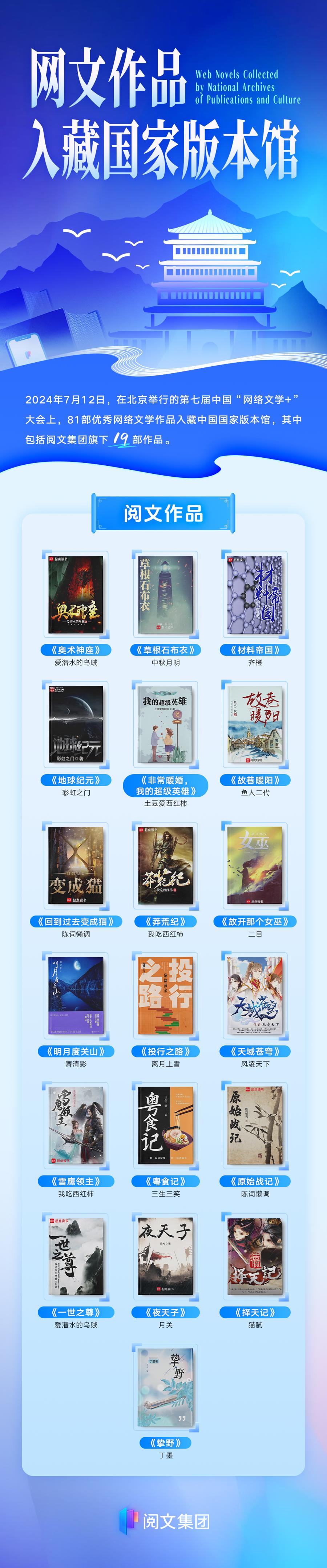 大會同時舉行優秀網絡文學作品入藏中國國家版本館儀式,共計81部作品入藏,包括19部上海企業閱文集團旗下作品。至此,閱文旗下作品入藏國家版本館的數量增至76部,《慶余年》《大奉打更人》《詭秘之主》《全職高手》等眾多經典名列其中,覆蓋科幻、現實、歷史、仙俠、玄幻、言情等多元品類,呈現出網絡文學類型結構持續優化的發展趨勢。近年來,閱文旗下作品陸續入藏中國國家圖書館、國家版本館、上海圖書館和大英圖書館,累計數量逾300部次,推動中國網文走向全球文化市場,成為網絡文學主流化、精品化加速發展的縮影。