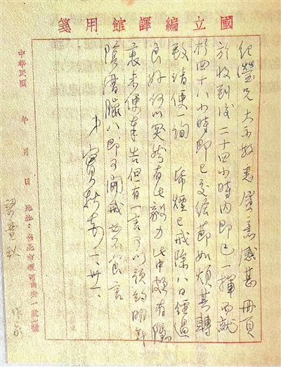 這封信所用國立編譯館用箋。梁先生1949年赴臺,歷任臺灣省立師范學院教授、英語研究所主任、文學院院長,臺灣大學教授。晚年曾代理“國立編譯館館長”直至1966年退休。由此推斷,梁先生的戒煙時間與信中所說的“戒煙已八日,經過良好”相吻合。