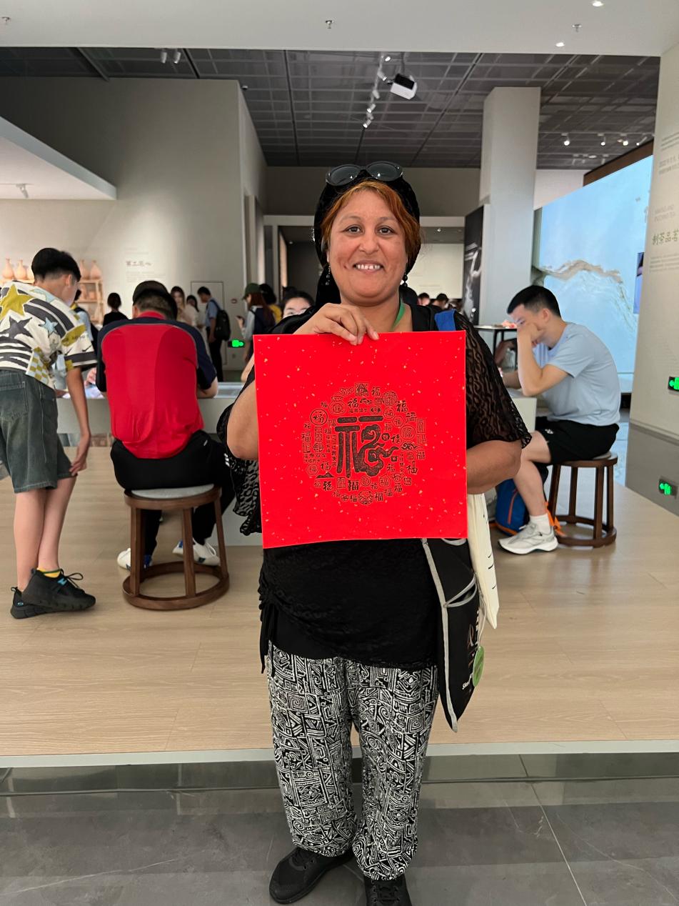 在浙江省非遺館,詩人們觀摩了西湖龍井的制作過程。沙特詩人胡達·穆巴拉克是一位中國茶愛好者,對前一天在晚宴上喝到的西湖龍井十分喜愛,親眼看到西湖龍井的炒制過程讓她非常興奮,制茶師父抓了一把熱乎的龍井示意胡達聞一聞,感受茶葉的香氣,“太美妙了!” 胡達贊嘆。南非詩人蓋蕾婭·弗雷德里克斯則向記者展示了她在體驗雕版印刷技藝時所完成的作品——紅色的紙上印滿了大大小小字體各異的“?!?,“他們說這代表著許多的好運!” 蓋蕾婭對親手制作的福字帖非常滿意。