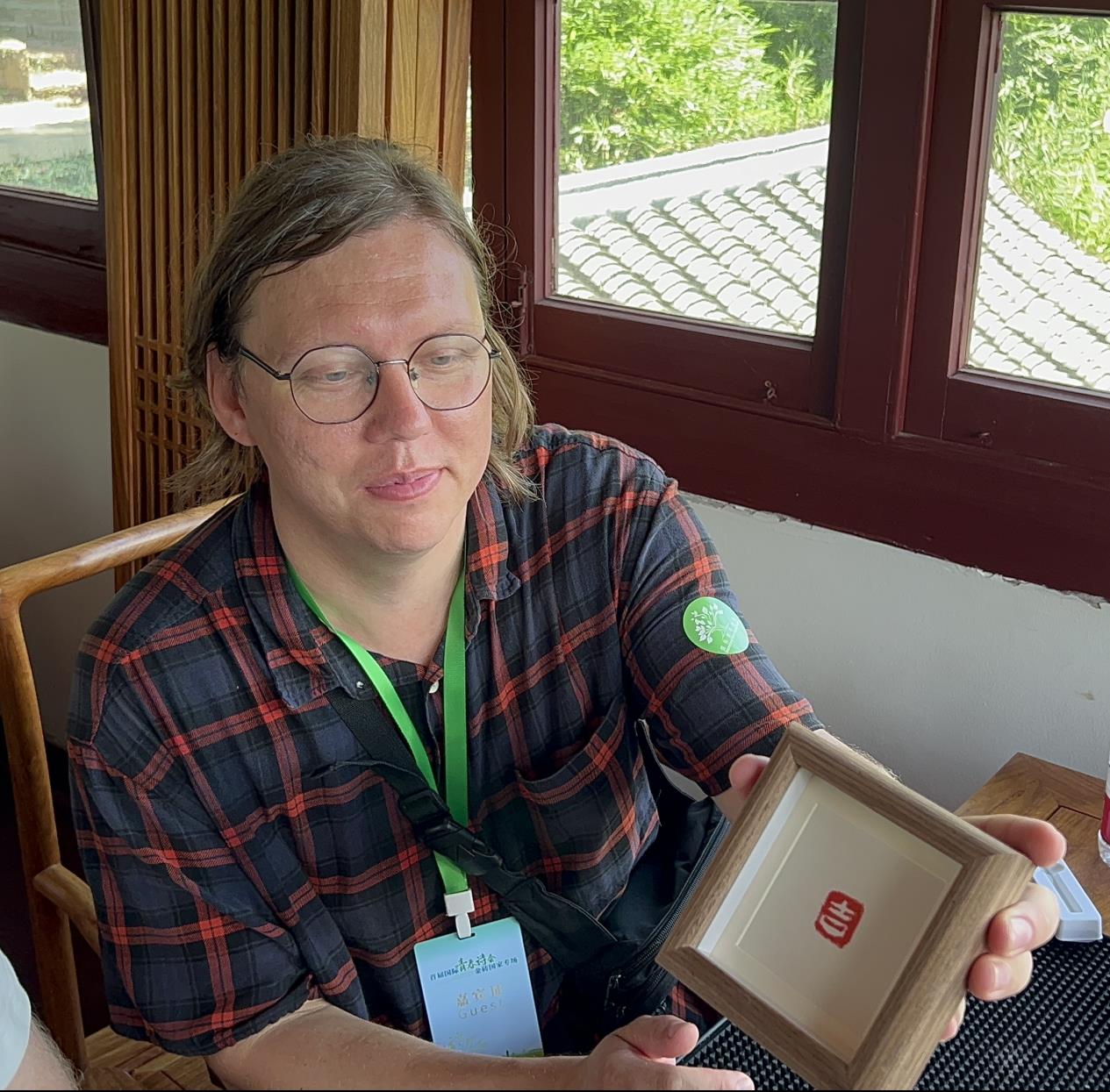 登島后,詩人們兵分兩路,一隊前往蘇白二公祠,拜謁兩位前輩詩人、“杭州老市長”——蘇軾和白居易,聆聽這兩位著名中國古代詩人在西湖“山水功成”的經歷和貢獻,并向他們獻花致敬。在這一刻,詩歌讓大家穿越古今中外遇。而另一隊詩人則來到了著名的有百年歷史的西泠印社,在這里,他們親手篆刻了一枚屬于自己的印章,以最生動的方式感受古代中國文人墨客的生活和雅興。返回的路上,印度詩人普里特威拉杰·陶爾撐著一把中國傳統樣式的傘,這并不是他買的紀念品,而是一位路過的女士送給他的禮物。陶爾非常驚喜,站在湖邊驕傲地向大家展示他收到的這份溫暖的禮物。