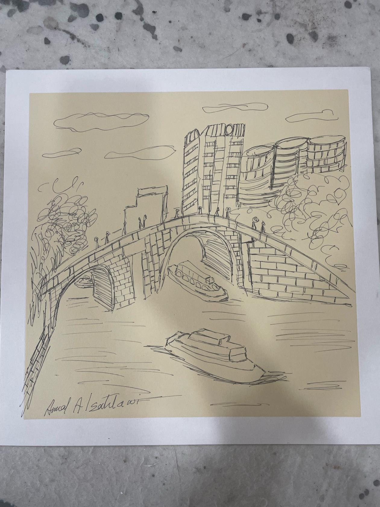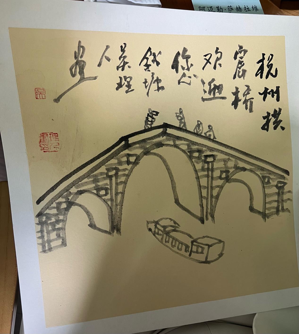 在大運河博物館,阿聯酋詩人阿邁勒·薩赫拉維被一位正在描繪運河的畫家吸引,停下了參觀的腳步。吳理人是杭州人,他筆下的運河不僅是風景,同時飽含深情與記憶,他的畫作打動了阿邁勒。她拿起筆,畫下了象征著京杭大運河到杭州的終點標志——拱宸橋,吳理人也同時畫下心中的拱宸橋,兩人互贈畫作。此時,拱宸橋就是聯結兩國的友誼之橋。