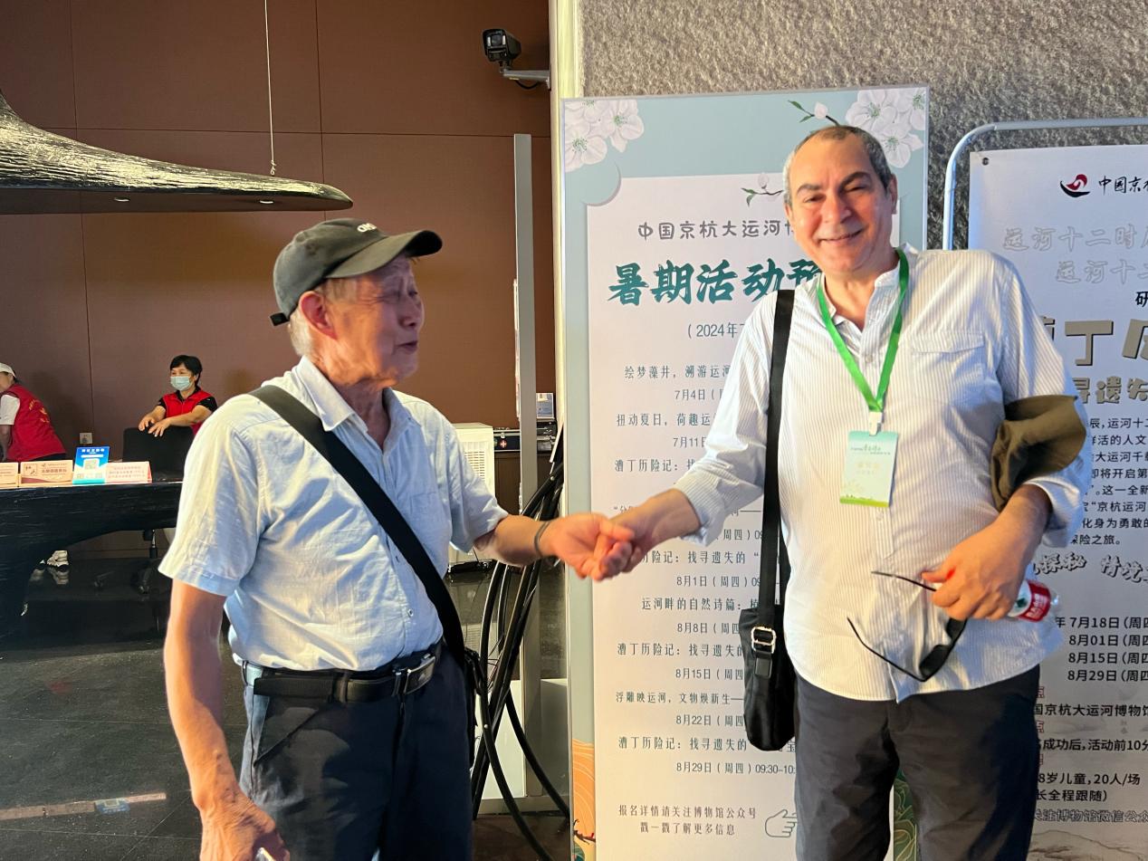 友誼流淌在中國畫家與阿聯酋詩人之間,也流淌在一位杭州老人與埃及詩人艾哈邁德·葉麥尼之間。與老伴一同來參觀大運河博物館的杭州老人葉際邁對艾哈邁德表達了杭州人民的熱情歡迎:“杭州非常美麗,歡迎多多來中國!”這是艾哈邁德第一次參訪中國,他感動于當地人的熱情與友善,也對中國文化深有感觸:“埃及和中國一樣擁有古老燦爛的文明與歷史,中國人幸運地一直傳承了自己的語言,相比之下,埃及則失去了自己的傳統語言,這是我們需要面對的問題?!?/p>
