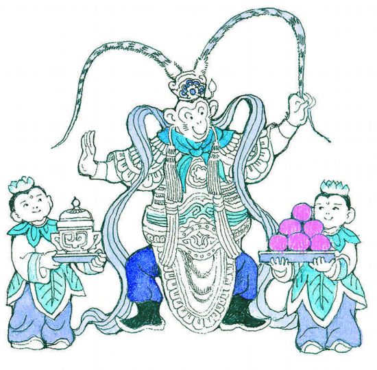 其次,此書堅守了原著的人文精神。原著最具文化普適性的主題是不畏艱難的取經精神。兒童的身體和精神皆需成長,成長就是不斷克服困難的學習歷程?!皩W以成人”既是儒家的修身目標,也是取得真經的隱喻。最初猴王在花果山上整天吃喝玩樂反生厭倦,故而魯兵把猴王離開花果山的起因界定為外出拜師學藝。離家是兒童成長的經典姿態,也是英雄成長的起點。猴王陷入困境、離家歷險、愿望滿足、重返家鄉的敘事模式便是兒童將要經歷的人生之路的象征,而且也是中華民族自強不息精神的完美體現。