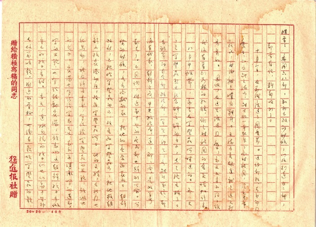 最后一封寫于10月6日的信可被視為這段激流生活的片尾預告。由于當晚收到47軍軍報《猛進報》的約稿,所以便用猛進報社所贈的印有“贈給積極寫稿的同志”的5頁紙來寫信。李蕤向妻子報告了一件喜事,那就是他在朝鮮與七年未見的妻弟白玉重逢,二人促膝長談過去和新生活,最為慨嘆的便是當年被國民黨抓兵之后的悲慘,與逃脫之后在共產黨這里獲得的解放形成了鮮明對比。同時,他還囑咐妻子可無需再往朝鮮給自己寫信,因為回到祖國的日子近了。