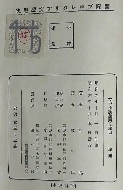 《阿Q正傳》日譯本版權頁