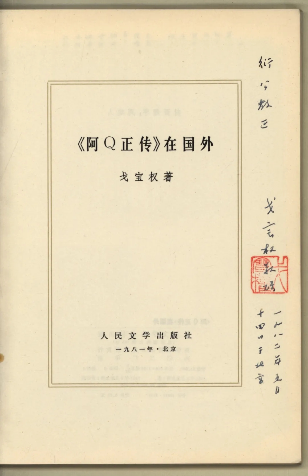 戈寶權寫這封信的落款時間是一九八一年十一月二十三日,“現送上我寫的兩本有關魯迅的書:《魯迅在世界文學上的地位》和《〈阿Q正傳〉在國外》,請你多多指正!”而《〈阿Q正傳〉在國外》扉頁贈書的題款:“衍公教正 戈寶權敬贈 一九八二年三月十四日于北京”,落款時間相差了幾個月,不知何故,非常有趣的閑筆。