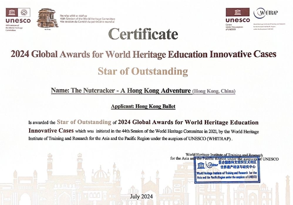 7月30日,香港芭蕾舞團(港芭)以藝術總監衛承天的《胡桃夾子─香港圣誕之旅》及其小區外展活動榮獲聯合國教科文組織2024年全球世界遺產教育創新案例“卓越之星”獎。