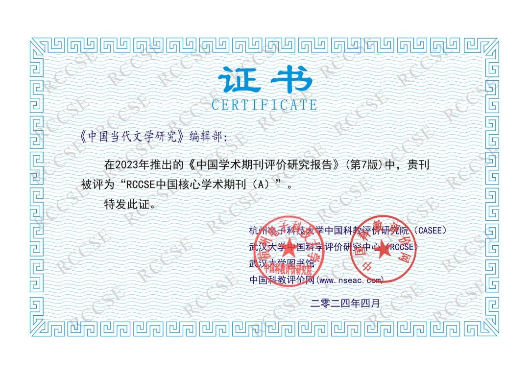 RCCSE中國學術期刊評價體系是目前國內公認的七大學術期刊評價體系之一,由杭州電子科技大學中國科教評價研究院、武漢大學中國科學評價研究中心、武漢大學圖書館、中國科教評價網(www.nseac.com)聯合啟動。本次共認定及收錄中文學術期刊6622種,按學科分類,根據期刊的綜合評價得分排名并劃分等級,《中國當代文學研究》位列60種文學類學術期刊第9名,被評為A類(核心期刊)。該評價體系是信息資源管理部門、出版管理部門、科研成果管理部門、期刊出版機構和廣大科研人員的重要參考工具。