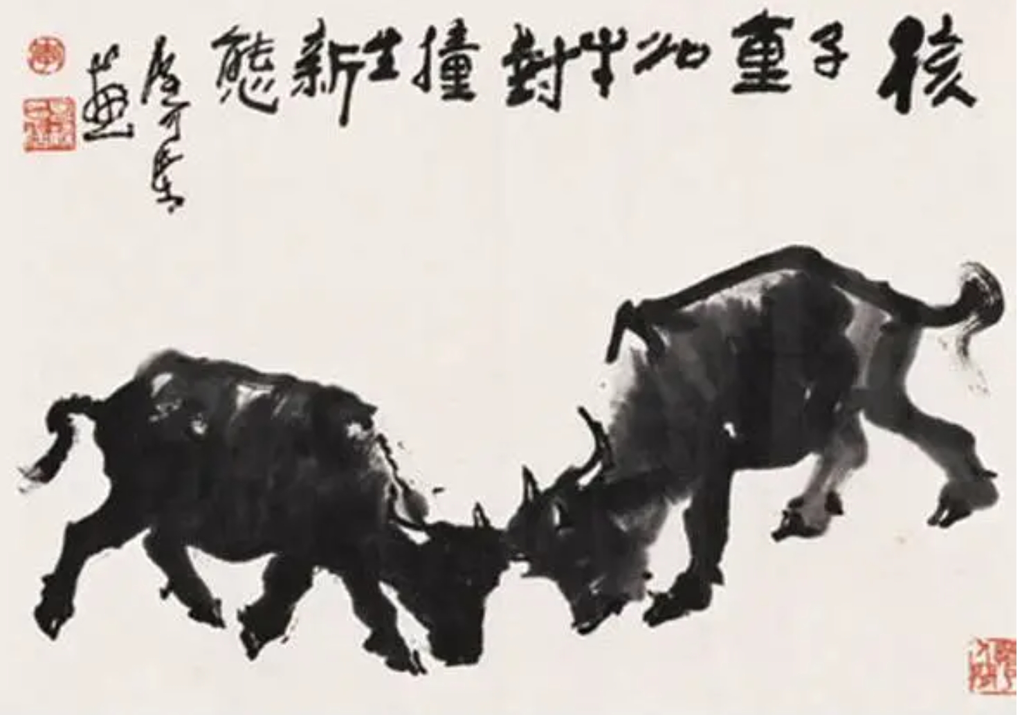 1989年5月,中國高等科學技術中心召開《場、弦和量子引力》國際學術研討會,李政道邀請到了李可染作主題畫,李可染畫出了一幅《超弦生萬象》,后來在1989年6月,又為《相對論性重離子碰撞》國際學術研討會,畫出了一幅《核子重如牛,對撞生新態》,畫的是兩頭壯實的公牛肌肉緊繃,拼出了所有力氣,低頭對撞。李可染先生曾經畫遍了層林盡染,滿山紅遍,表現出無限風光盡收眼底的瀟灑與展括,但在畫完這幅雙牛對撞之后,卻是氣喘吁吁,連說太累了,太累了。他是在牛的對撞之間,感受到巨大而又猛烈的風馳電掣千鈞之力。正負電子就像兩匹高速奔跑的牛,死命地撞向對方,二者相遇的一剎那,如電閃雷鳴,火花四濺,就在這些像焰火一般四射的碎片中,科學家從中捕捉到可能從未發現過的物質。