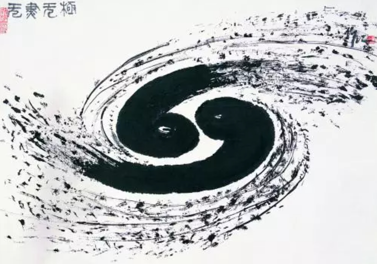 1988年在舉辦《二維強關聯電子系統》國際學術研討會時,李政道請來了吳作人先生,大師心領神會,運用中國古代哲學的觀念,認為所有的復雜性都是從簡單性產生的,正如李政道先生特別喜愛的老子《道德經》中所言“道生一,一生二,二生三,三生萬物?!钡?,如何從簡單到復雜的呢?通過科學實驗人們得知,正負電的粒子之間的相互作用,形成了原子分子以至世界萬物。正負兩極的對偶結構,在中國古代哲學里稱之為“陰陽”,太極符號表現的就是陰陽之間的關系。吳作人就此畫了一幅變形太極圖《無盡無極》,他揮灑筆墨,心連天宇,兩道反向交織又指向無邊境界的力與光,浩浩淼淼,飄然而又無所不及。