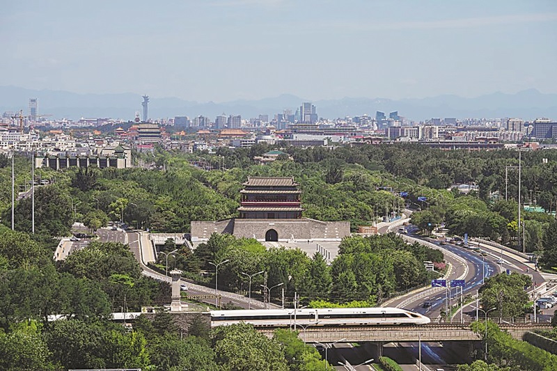 “北京中軸線”縱貫北京老城南北,始建于13世紀,成型于16世紀,此后經不斷演進發展,形成今天全長7.8公里、世界上最長的城市軸線。圖為7月18日一列復興號高鐵列車駛過北京永定門城樓前。 新華社記者 鞠煥宗 攝