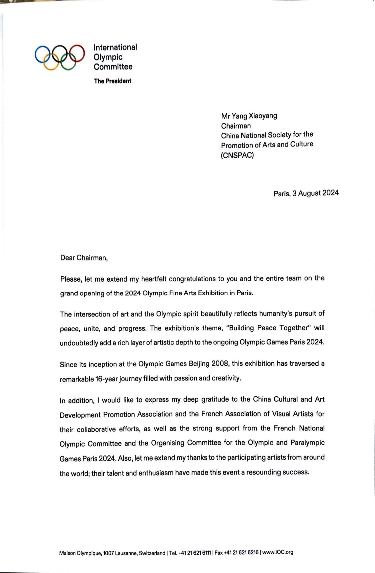 2024年8月8日,受國際奧委會邀請和巴黎奧組委授權,在法國奧委會和中國文學藝術基金會的大力支持下,由中國文化藝術發展促進會和法國造型藝術家協會共同主辦、中國書法大廈協辦的“共筑和平——2024(巴黎)奧林匹克美術大會”開幕式,于當地時間8月8日晚7時在巴黎塞納國家音樂中心盛妝啟幕。
