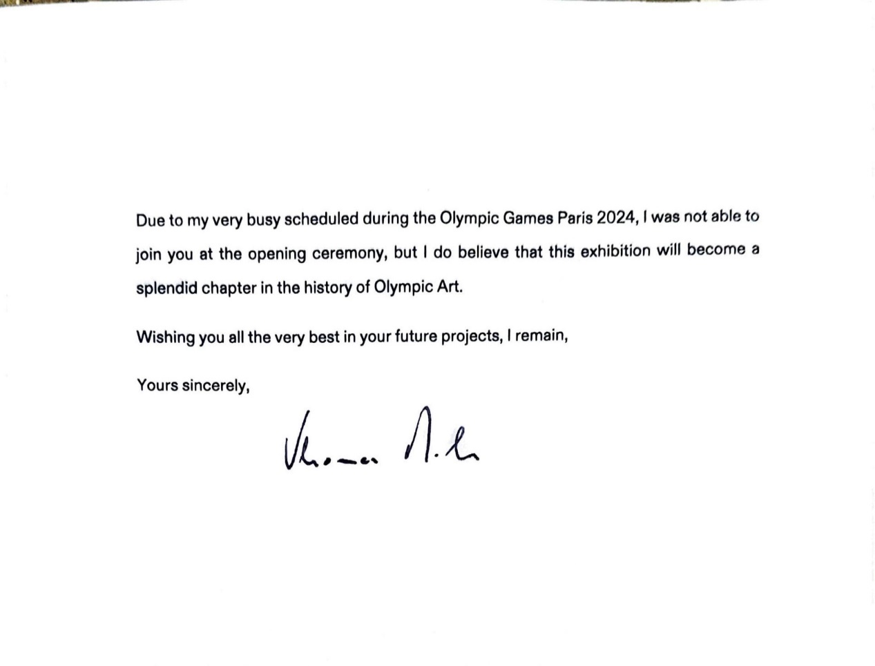 亞奧理事會副主席、體育委員會主席宋魯增宣讀了國際奧委會主席托馬斯·巴赫給中國文促會主席楊曉陽發來的賀信,他在賀信中談道:藝術與奧林匹克精神交相輝映,共同傳遞著人類對和平、團結與進步的追求。此次以“共筑和平”為主題的展覽,必將為正在進行的巴黎奧運會增添濃郁的藝術色彩。這項展覽品牌自2008年北京奧運會時期創辦以來,堅持走過了16年的歷程,這是一段充滿激情與創造力的征程。相信本次展覽必將成為奧林匹克藝術史上的絢麗華章。