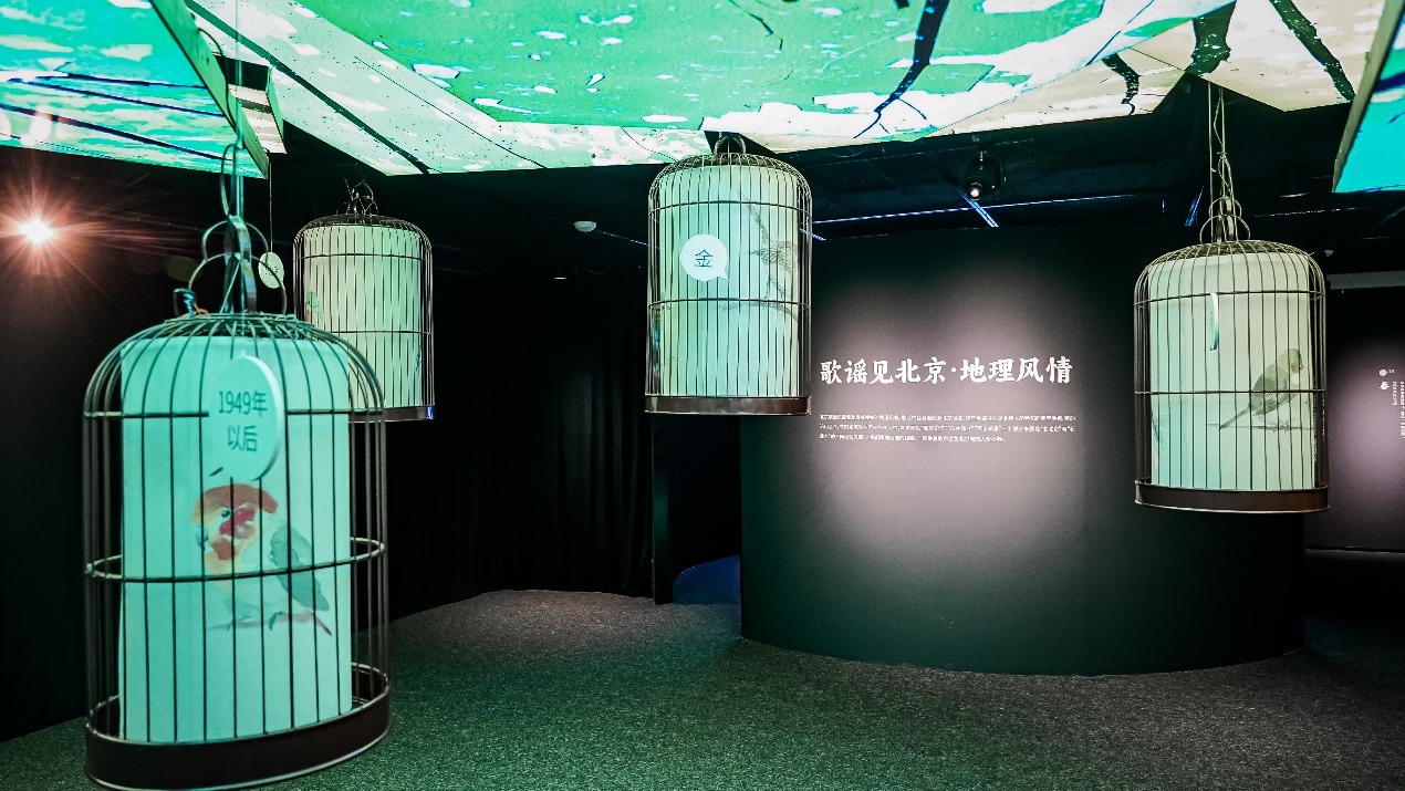 展覽中一棵翠綠的“大樹”,掛滿了高低不同的鳥籠,讀者不僅可在此享受夏天樹下納涼場景,感受年輪的流轉,還可童趣般地將腦袋探入鳥籠聆聽童瑤帶來的別樣歡樂。金代《泰和年間童謠》 、元朝《腳驢斑斑》、明朝《明正統京師童謠》等眾多具有歷史代表性的童謠,在鳥籠中歡唱著。用紗幕投影動態展示的北京街道影像,把胡同小吃和時令節氣等人文主題童謠,融合在春、夏、秋、冬的季節光影里,讓讀者身臨其境地感受著老北京歌謠的繽紛多彩與活潑可愛?!秳⒉疁卦毂本贰度f壽山》《魯班爺鋸白塔》《前門樓子高不高》《前門情思大碗茶》等體現城市記憶、市井商業的歌謠,以及民間流傳的歌謠、叫賣調、北京地區環境音、風聲、雨聲配合著圖文互動大屏為讀者精彩呈現。