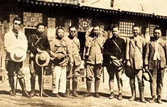 中方部分團員出發前合影,左二為黃文弼、左四為袁復禮、左五為團長徐炳昶