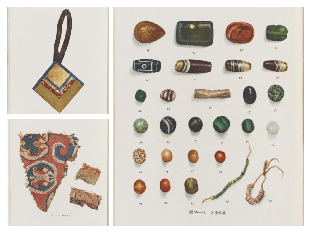 舍利袋、絳地雙魚紋錦殘片與各種飾品,著色,載黃文弼著《塔里木盆地考古記》(1958)