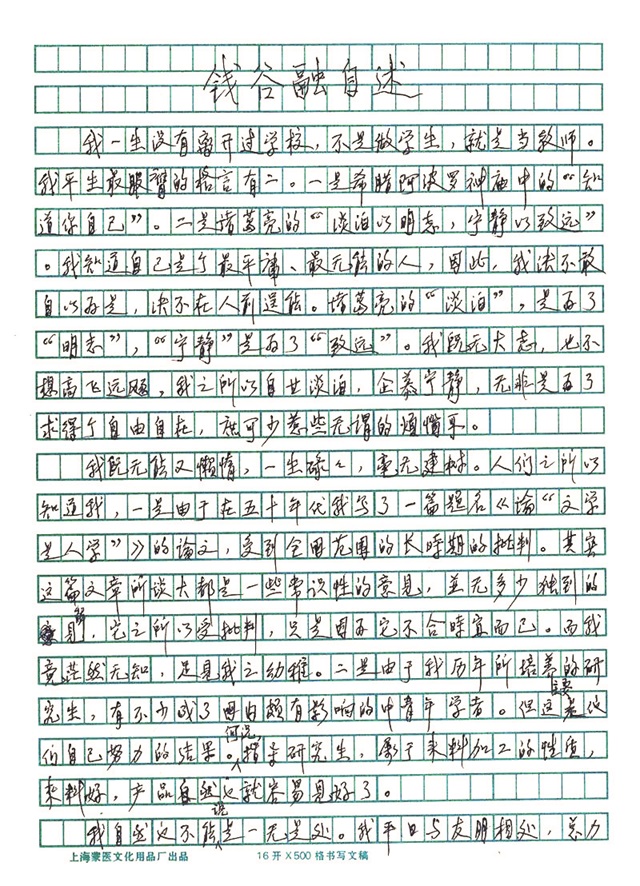 錢谷融自述手稿 圖片由普陀區圖書館提供,收錄于華東師范大學名師庫數字平臺