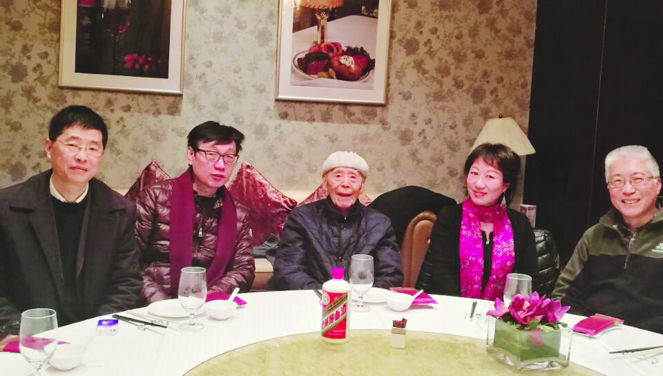 二〇一七年大年初一的團聚,弟子許子東(左二)、王曉明(右一)、楊揚(左一)、王雪瑛(右二)等向錢谷融先生恭賀新春 圖片由作者提供