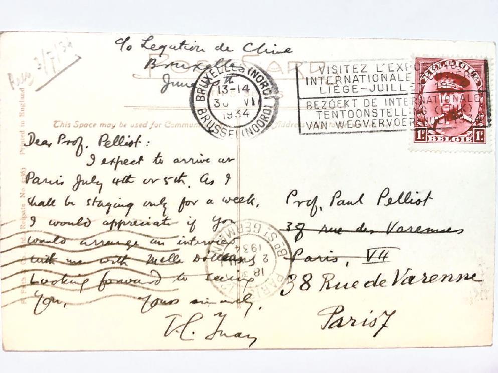 信件中也多有學術訪問交流活動的記錄。伯希和在1932—1933年、1935年到訪中國,停留了數月時間,在北平期間,不僅多方演講,并且頻頻參加筵宴。袁先生多次請伯希和餐敘,安排講座,并安排他在故宮博物院調閱意大利耶穌會士郎世寧的畫作。而先生為圖書館公務也多次出訪,我們在信件中可見到先生工作的繁忙。特別是先生在1934年、1945年兩次訪問歐洲,考察圖書館事業,其中1934年這次停留時間最久,6月至11月間訪問了比利時、法國、德國、奧地利、英國、西班牙、意大利等國的圖書館,并赴西班牙參加學術會議,多次在巴黎與伯希和見面。1934年7月訪問巴黎時,還與后來到平館做交換的杜乃揚(Marie-Roberte Dolléans,1911—1972)小姐見面。先生到訪的城市包括布魯塞爾、巴黎、柏林、維也納、倫敦、馬德里、佛羅倫薩、羅馬,在羅馬期間,很可能與羅馬大學漢學教授華嘉(Giovanni Vacca,1872—1953)晤面??箲鹌陂g由于局勢的原因,先生和伯希和的通信較少,存留的信中可見先生控訴日本帝國主義對中國圖書事業的摧殘,呼吁法國對中國圖書館的支持。這些通信為我們了解先生的學術活動提供了許多新的信息。