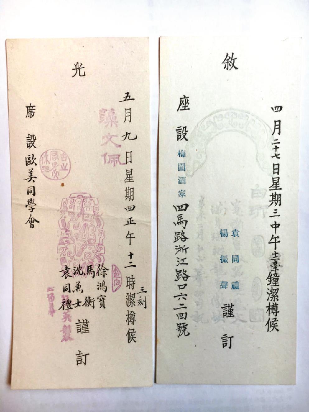 袁同禮為伯希和設宴之請柬,時間分別為1935年3月27日(請柬誤為4月)與5月9日